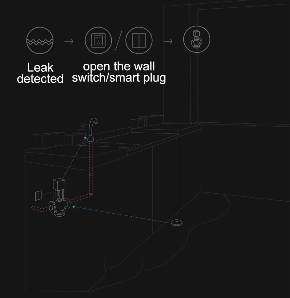 After detecting a leak, the Aqara Water Leak Sensor triggers the Aqara Smart Plug to turn off the solenoid water valve instantly.
